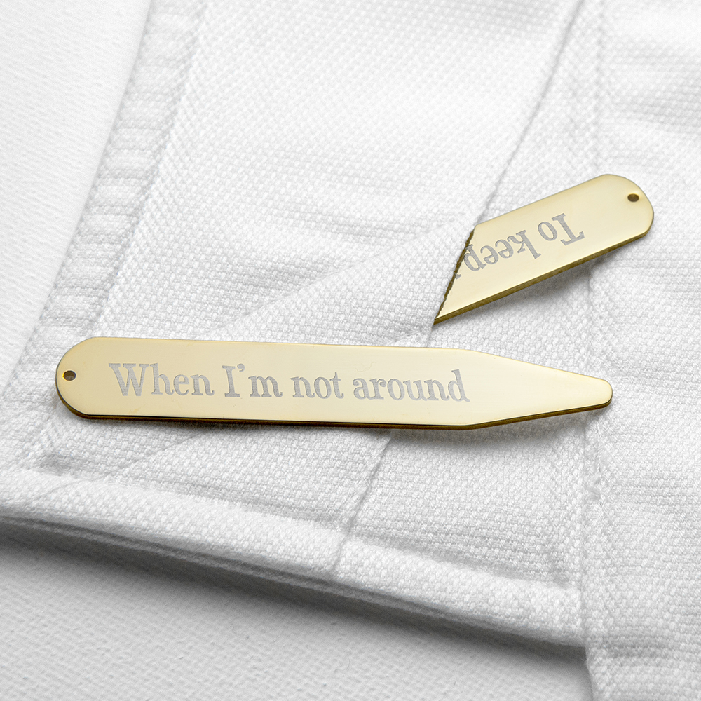 Combine luxury with a lasting sentiment. Our 18K Gold Plated Secret Message Collar Stiffeners are the ultimate fusion of sophisticated tailoring and heartfelt emotion. Crafted with a rich, radiant gold finish, these stiffeners not only keep a collar looking sharp but also serve as a hidden, tactile reminder of those who love him most.