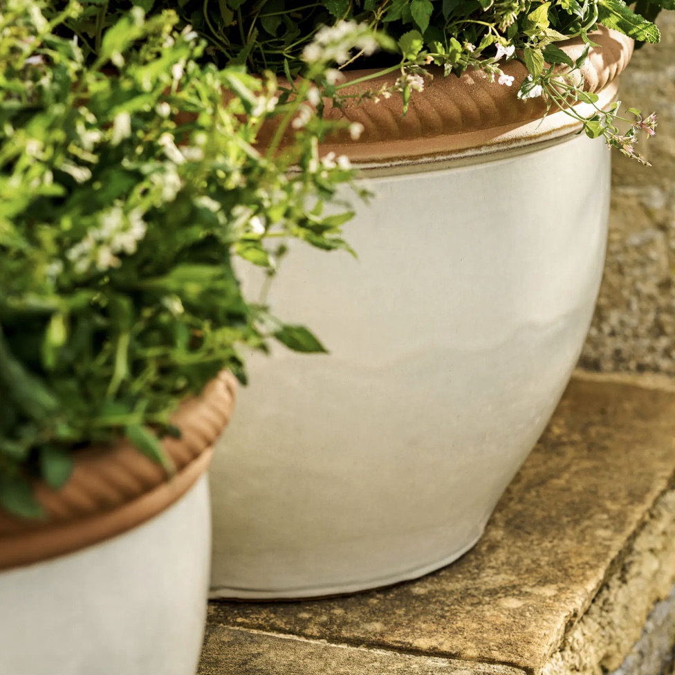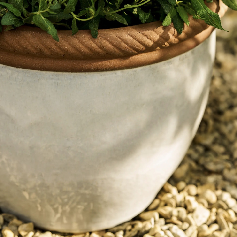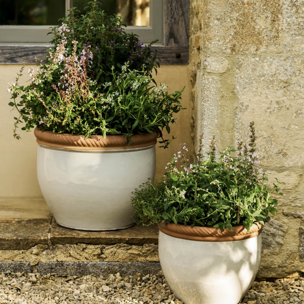 Design-wise, the unglazed twisted rim is the star here, offering an earthy, tactile contrast to the smooth ceramic body. At 8.5 litres, it’s the perfect size for a cluster of fragrant Mediterranean herbs or a delicate display of White Lavender. It’s fully frostproof and UV resistant, built to survive the British winter with just a little elevation to keep the drainage hole clear. Whether it’s sitting on a city balcony or a sprawling stone terrace, it turns a simple plant into a moment of refined botanical style.