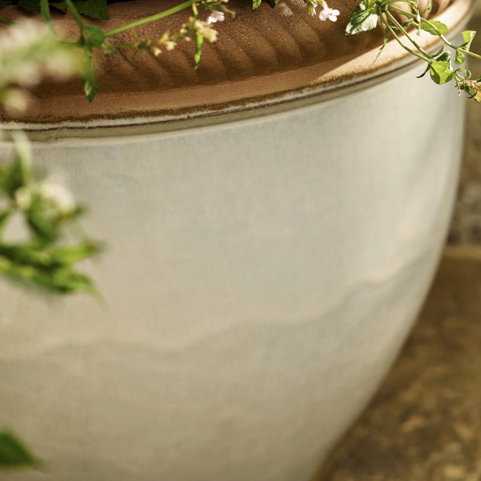 Complete the Set: “Build a layered terrace. Mix this white ceramic with our rustic Pots & Planters in various sizes for a curated, Mediterranean feel.”