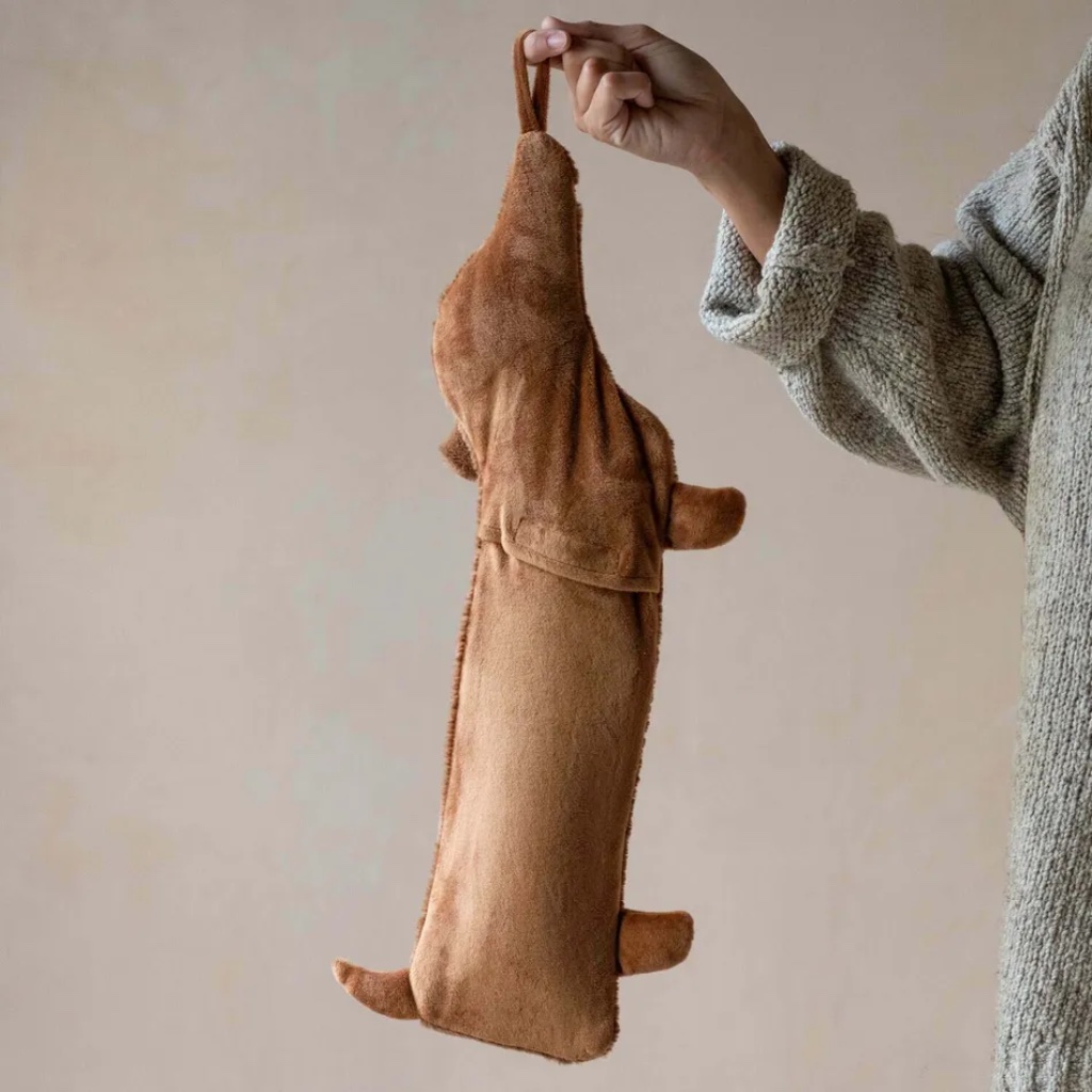 The soft, plush cover is shaped like a charming sausage dog, complete with floppy ears and a sweet, embroidered smile, making it an absolute delight to hold.