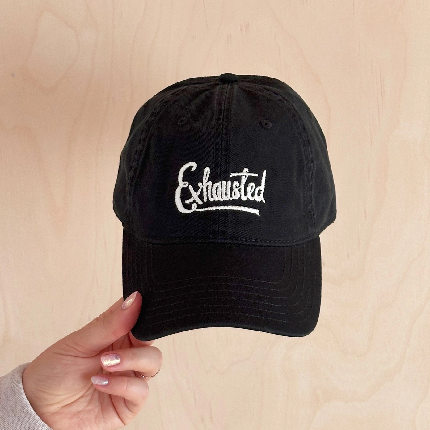 Designed for anyone running on fumes, our ‘Exhausted’ baseball cap is the perfect accessory for those days when “sheer willpower” is the only thing keeping you going. Crafted from high-quality soft, 100% cotton, this vintage-style ‘dad’ hat offers a relaxed, unstructured fit that feels comfortable from the first wear.