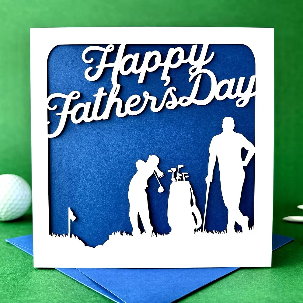 The crisp white top layer is precision laser-cut to reveal a vibrant background, creating a bold, architectural feel. It’s more than just a card—it’s the ultimate way to celebrate the man who never misses a tee time and always keeps his eye on the ball.
