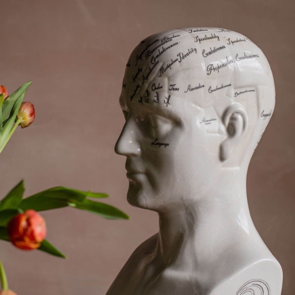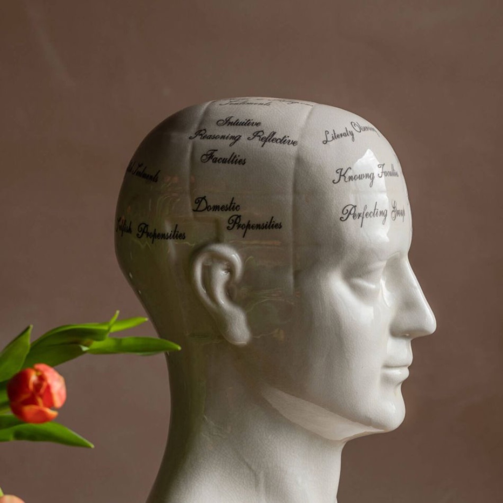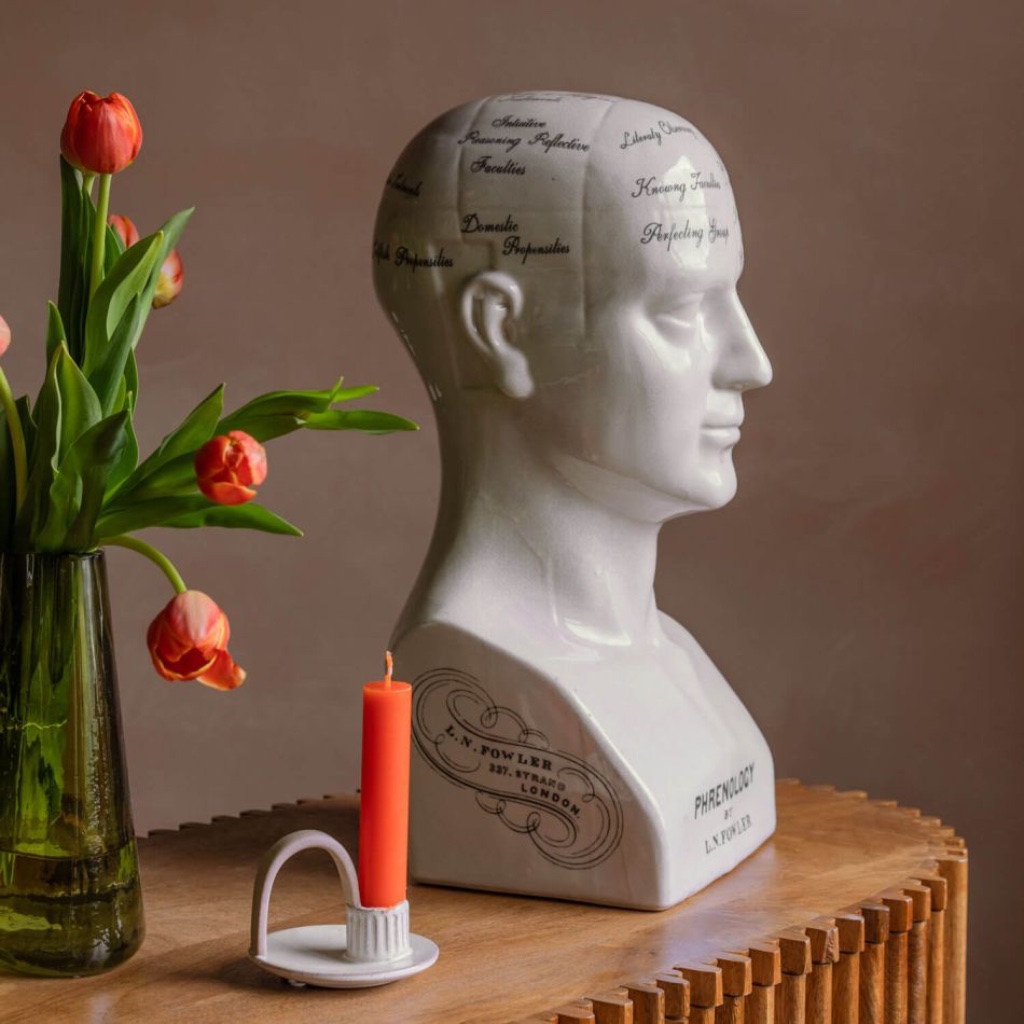 Crafted from porcelain and finished in an antique style, this phrenology head brings a touch of historical intrigue to any interior. Inspired by the 19th-century theory that personality traits could be mapped across the contours of the skull, it captures the spirit of a bygone fascination with character and classification.