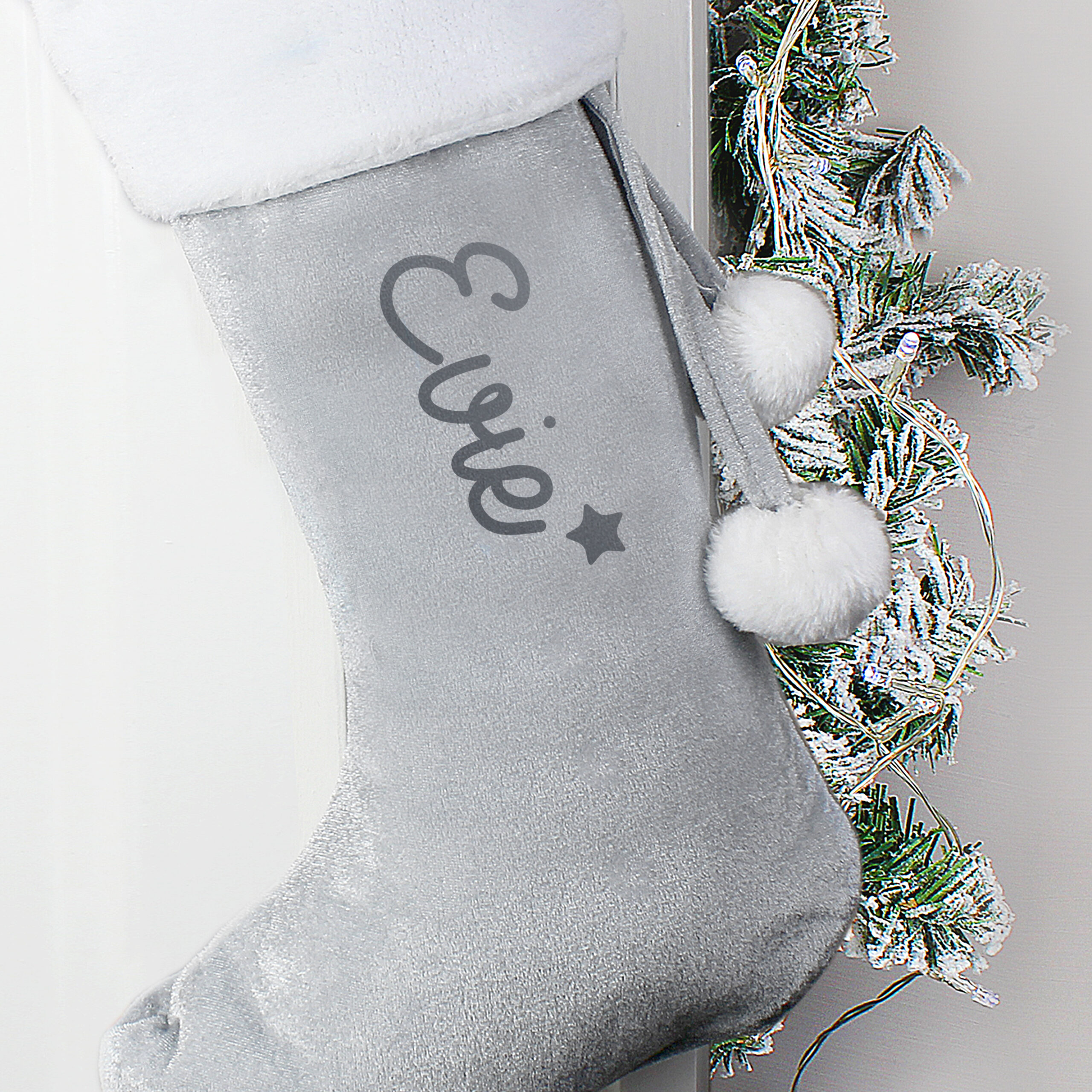 Our personalised Christmas stocking is made from soft silver faux velvet with a plush white faux fur cuff.