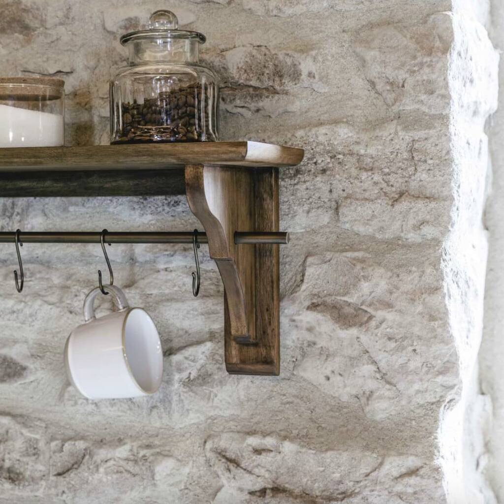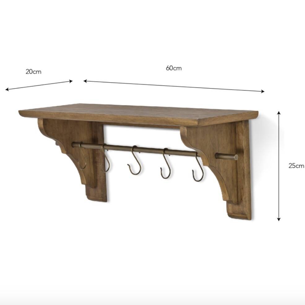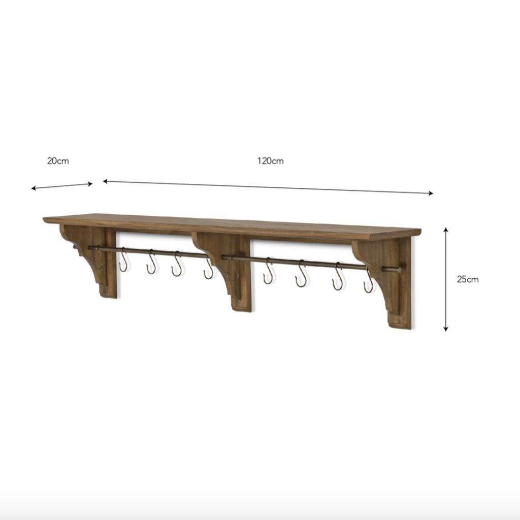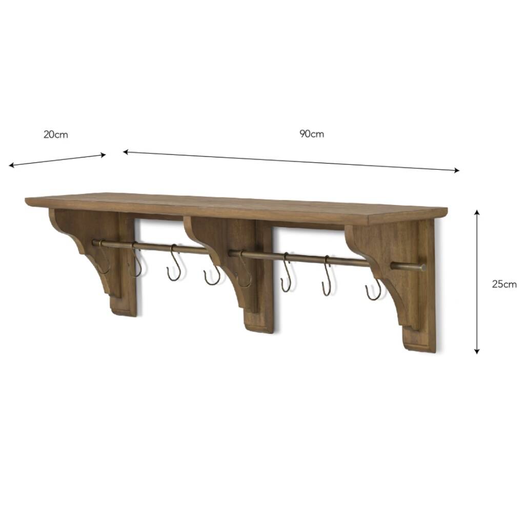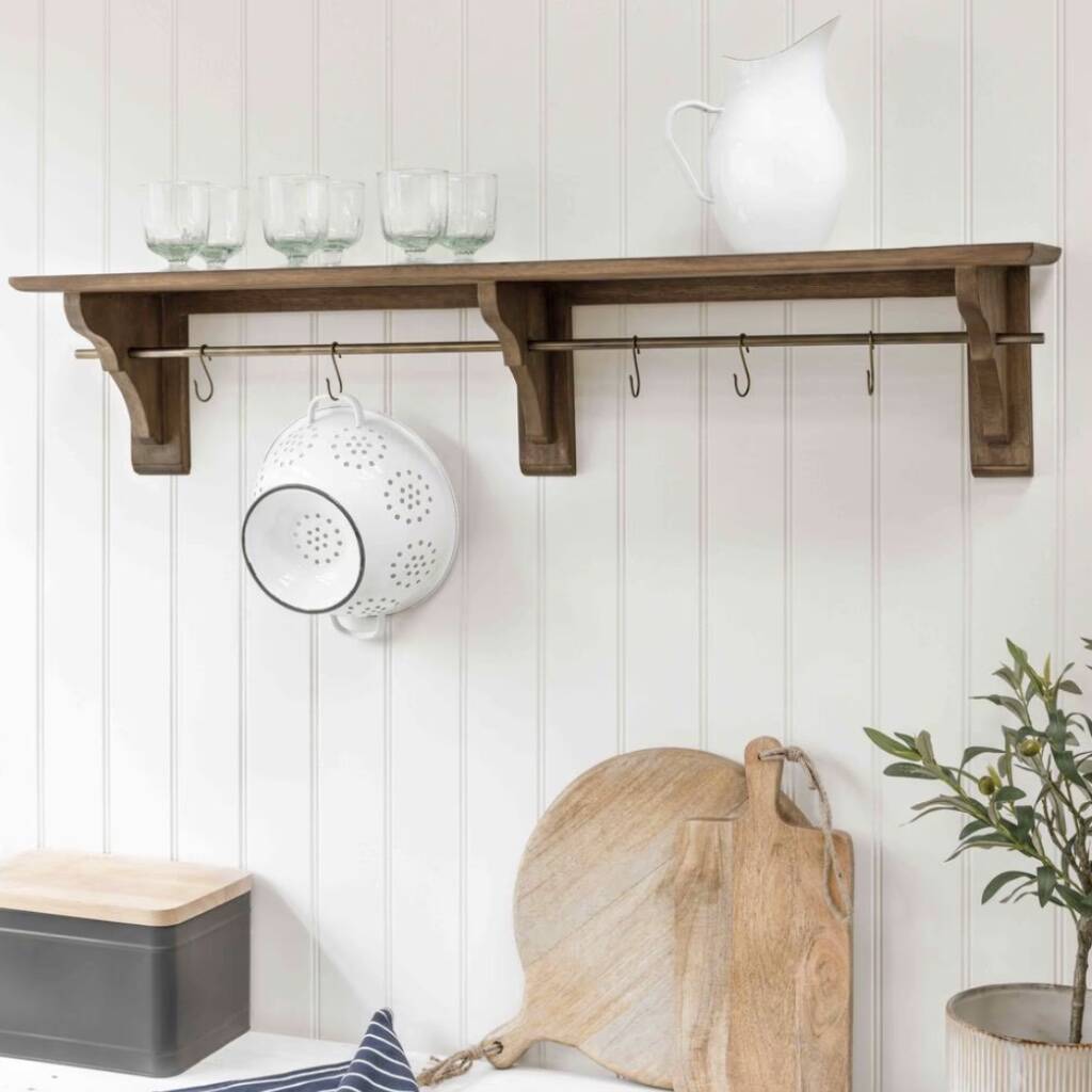 The upper shelf provides space for storage jars, cookbooks or decorative pieces, while the antique brass rail beneath features five matching hooks for hanging utensils and kitchen essentials.