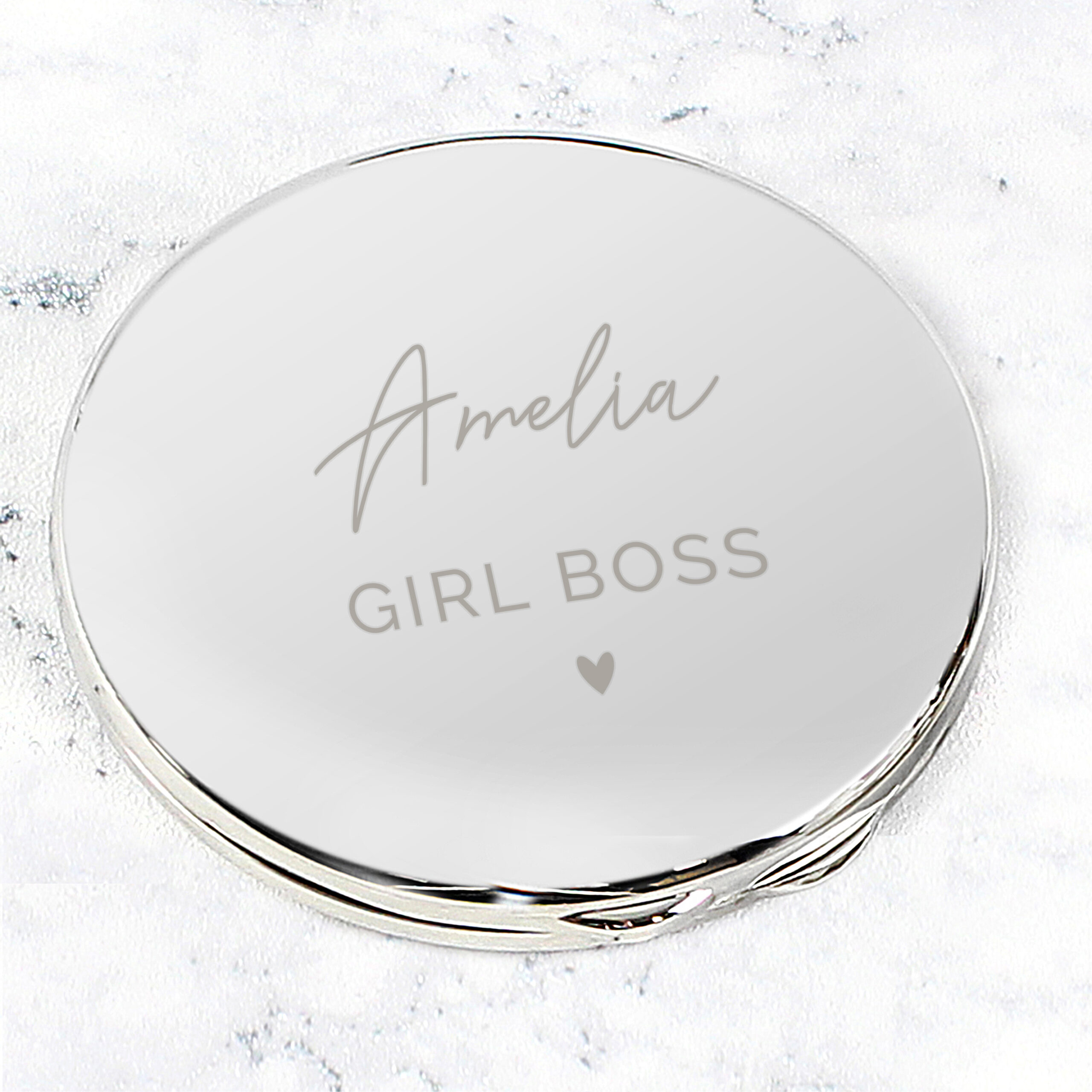 Whether it’s a gift for a bridesmaid, a best friend, or a treat for yourself, this polished Personalised Heart And Script Compact Mirror brings a touch of grace to every bag. The lid features your chosen text, allowing for two distinct lines of personalisation: a beautiful, flowing script-style message on the top line, followed by a name or role below. It is a timeless piece that blends functionality with a unique, personal touch.