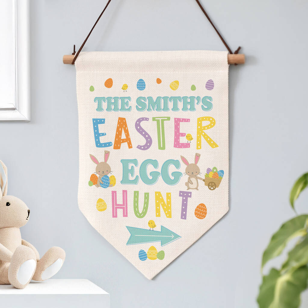 Personalise the banner with your family name or chosen name above the fixed “EASTER EGG HUNT” text to create a keepsake you can bring out year after year.