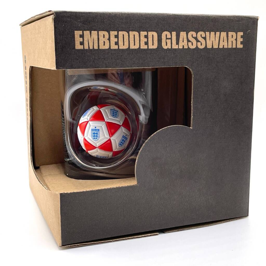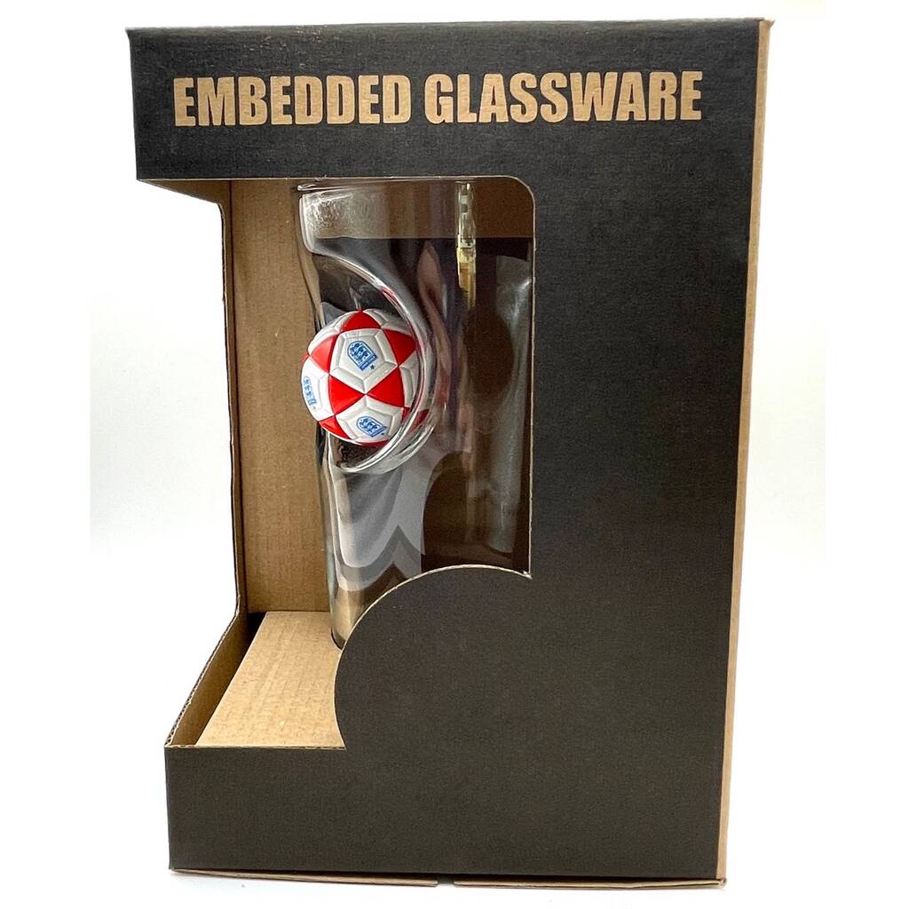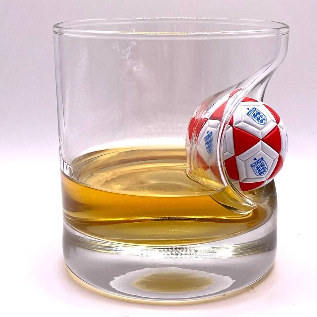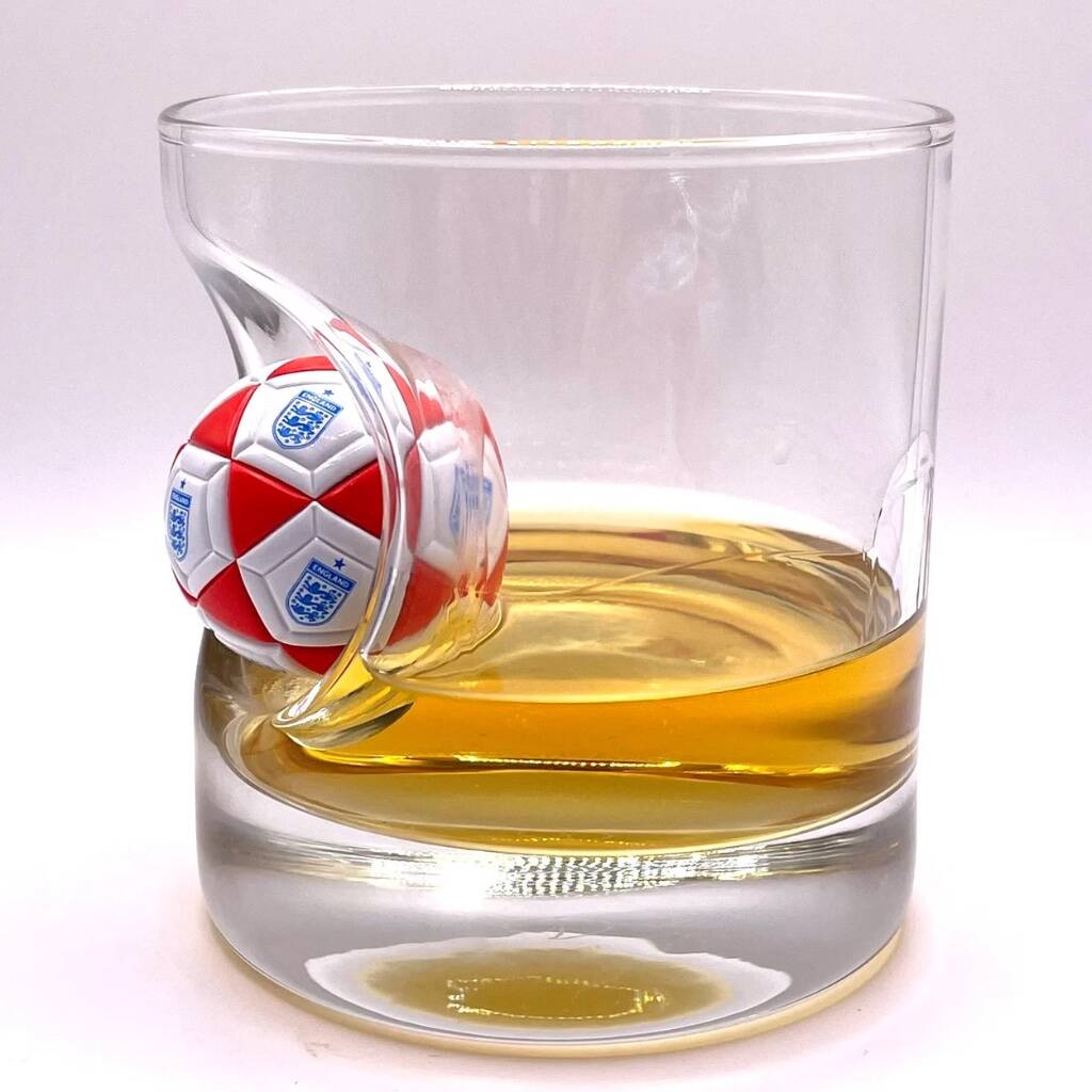 Our Personalised England Football Whisky Glass has a mini English football embedded into the side of the glass.