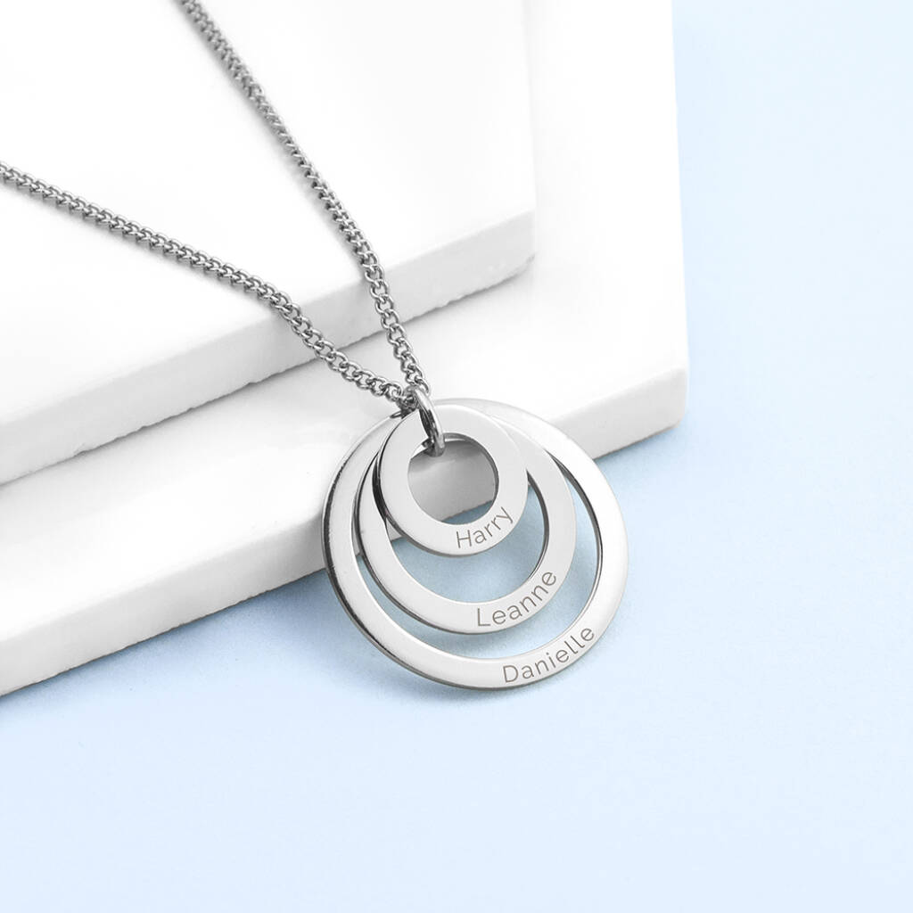 Each interlinked ring can be engraved with the name of a loved one, creating a unique necklace that reflects your personal family story.