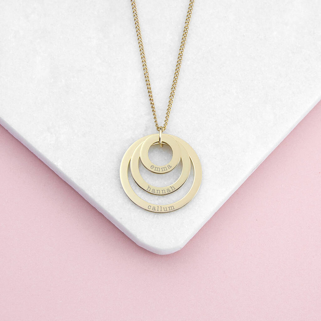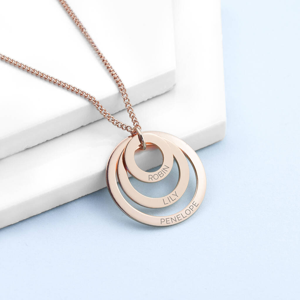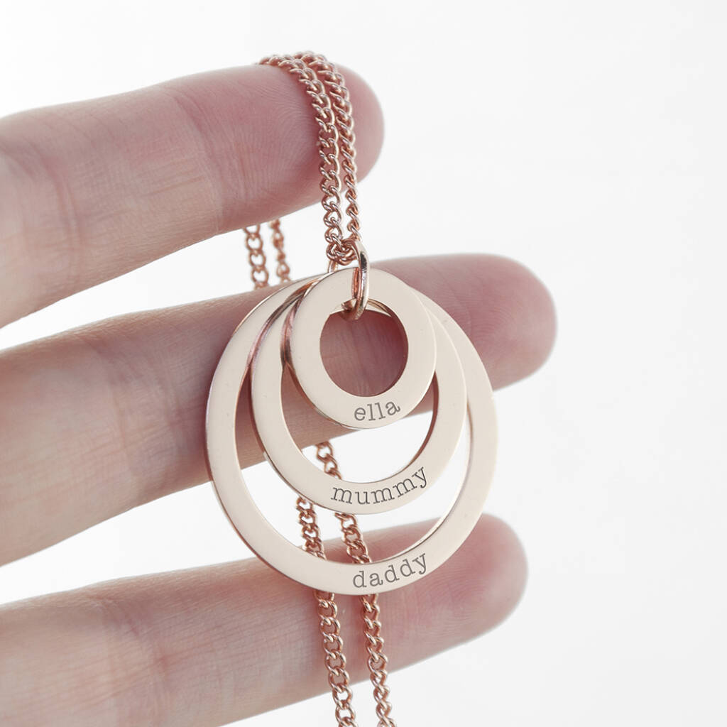 Celebrate the people who matter most with this personalised family names rings necklace. Designed to represent connection, love, and shared history, this piece is a meaningful way to keep your family close.