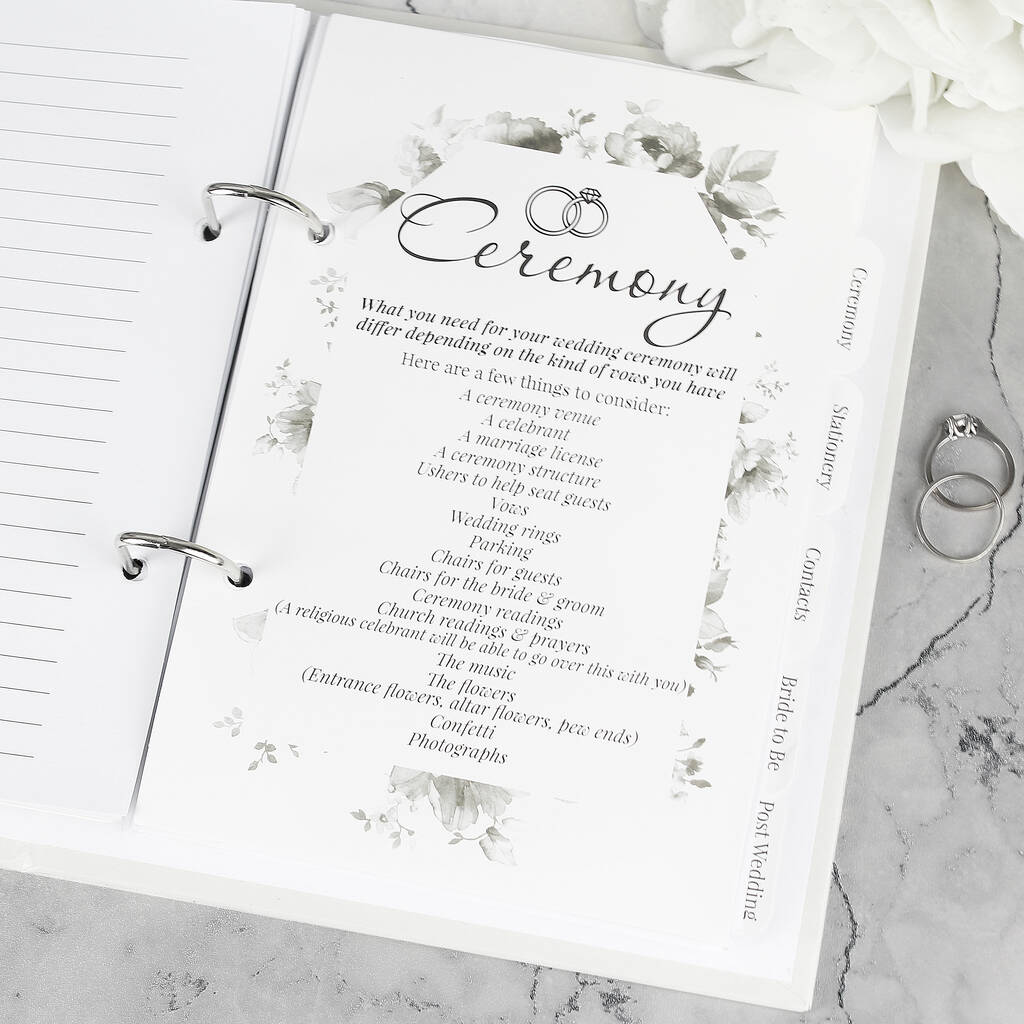 Includes sections for ceremony, stationery, contacts, bride-to-be and post-wedding
