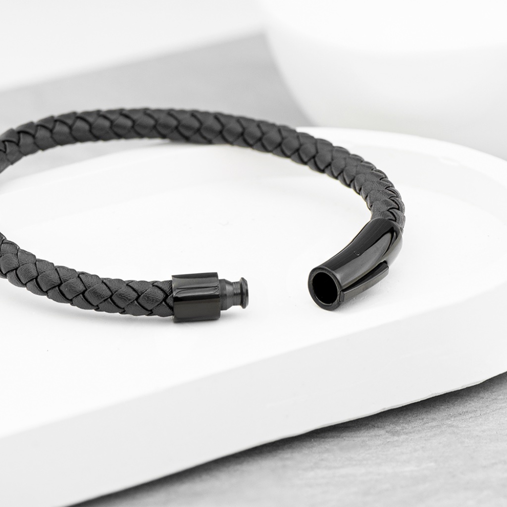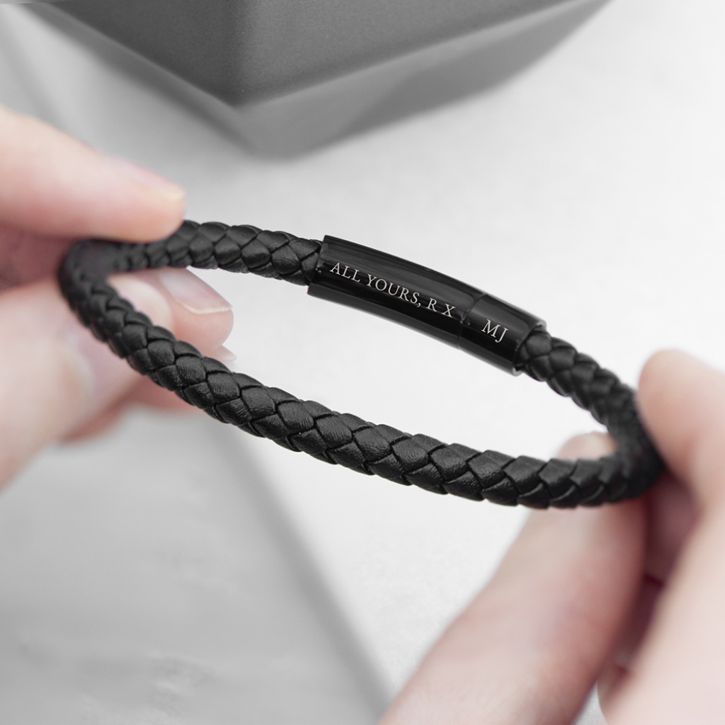 This luxury woven black leather bracelet is a refined statement piece designed for everyday wear and meaningful gifting. Crafted with care, the woven leather band delivers a strong, masculine look while remaining comfortable and versatile — perfect for both casual outfits and smarter occasions. Its timeless design ensures it will remain a staple in his collection for years to come. Make it truly personal with custom engraving. Add his initials, a date or a short message, and our engraving team will create a one-of-a-kind keepsake he’ll be proud to wear. Whether for a birthday, Christmas, anniversary or just because, this bracelet strikes the perfect balance between style and sentiment. Presented ready to gift, it’s a simple way to give something personal, stylish and genuinely meaningful. Product Details: Material: Woven black leather & metal Engraving: Initials, date or short message Length (Open): 21cm Diameter (Closed): 8cm x 0.8cm x 0.8cm Gift-ready presentation