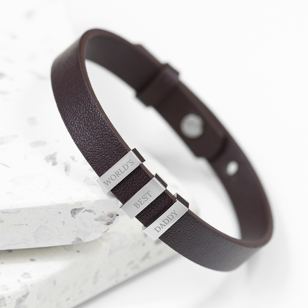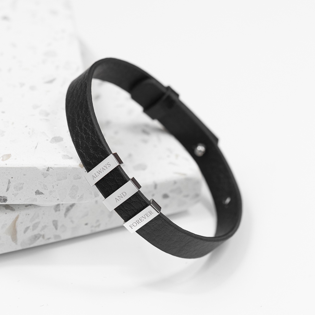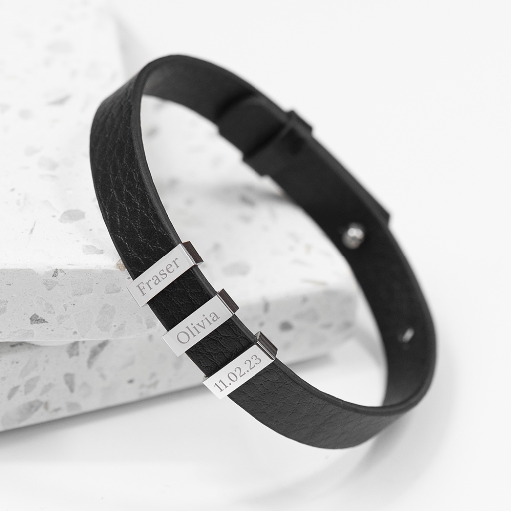 This stylish and contemporary black leather bracelet delivers understated luxury with a clean, modern edge. Designed for the man who appreciates refined simplicity, the Soho Tag bracelet makes a strong yet subtle statement — equally suited to everyday wear or smarter occasions. Add a personal touch with custom engraving. Include the names of loved ones, initials or a short meaningful message, and our expert engraving team will create a bespoke piece he’ll wear with pride. The sleek leather band and silver-plated tag combine to create a versatile accessory that works effortlessly with any style — making it a standout gift for birthdays, Valentine’s Day, Christmas or any special occasion. Presented in a smart black gift box, this bracelet arrives ready to impress and easy to gift. Product Details: Material: Black leather & silver-plated tag Engraving: Names, initials or short message Length: 32.2cm Width: 1cm Depth: 0.2cm Presentation: Black gift box