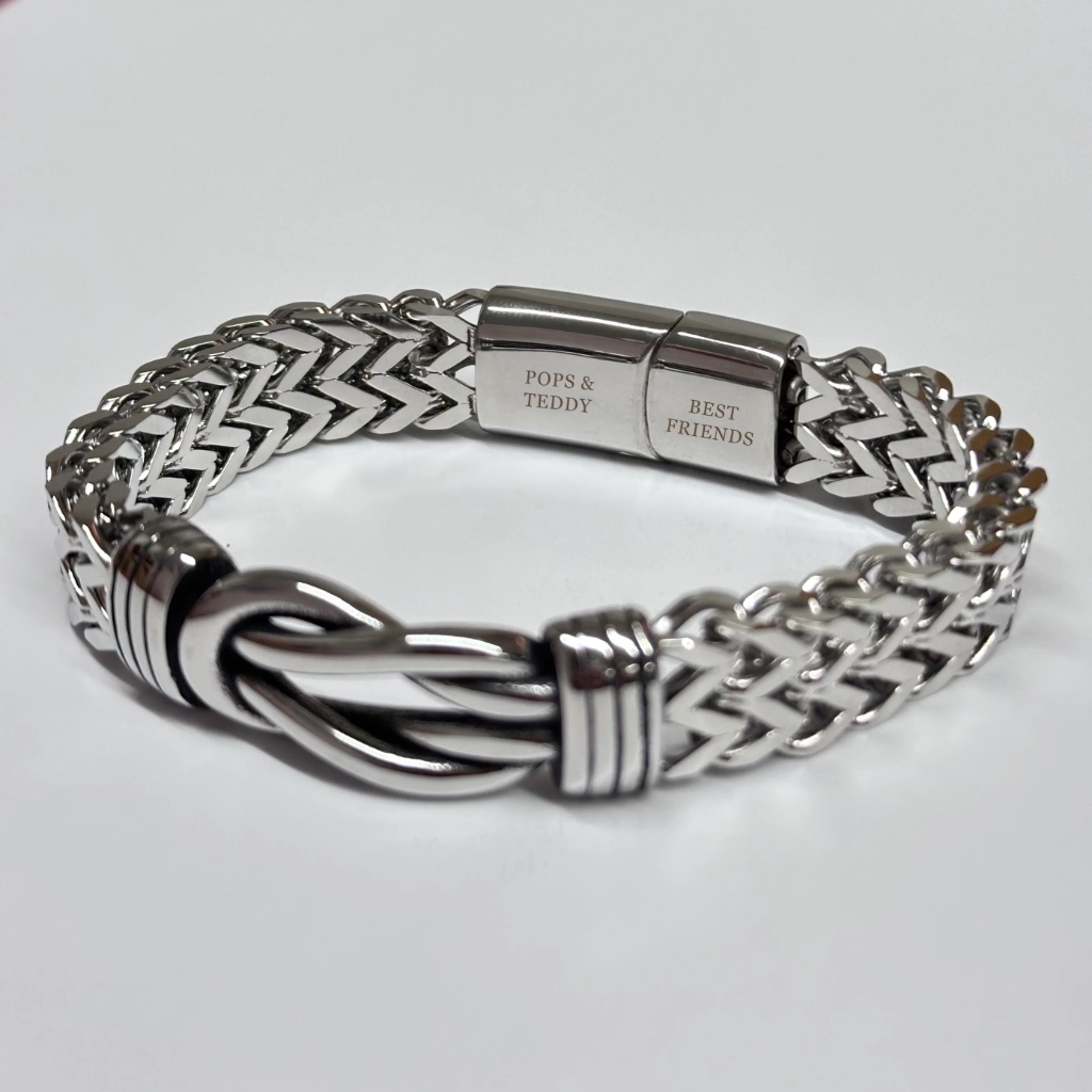 This premium stainless steel bracelet blends rugged construction with refined design, creating a powerful symbol of connection, strength and lasting meaning. The woven stainless steel band delivers a bold, masculine look, while the central infinity knot represents eternity, unity and unbreakable bonds — making it an ideal gift to mark relationships, milestones or meaningful moments. What sets this bracelet apart is the discreet custom engraving hidden inside the clasp. Both sections of the detachable clasp can be engraved with names, initials, dates or a short personal message, turning this into a deeply personal keepsake rather than just another accessory. Your engraving remains hidden when worn, adding a private layer of meaning known only to you and the wearer. Presented in a sleek, letterbox-friendly gift box, it arrives ready to gift — no wrapping required. How to open: Slide one side of the clasp upwards (like removing a jigsaw piece) to separate both sides. Product Details: Material: Stainless Steel Design: Woven band with infinity knot centre Engraving: Hidden inside clasp (both sides) Length (Open): 21cm Width (Closed): 8cm Height: 1.5cm Letterbox-friendly gift packaging