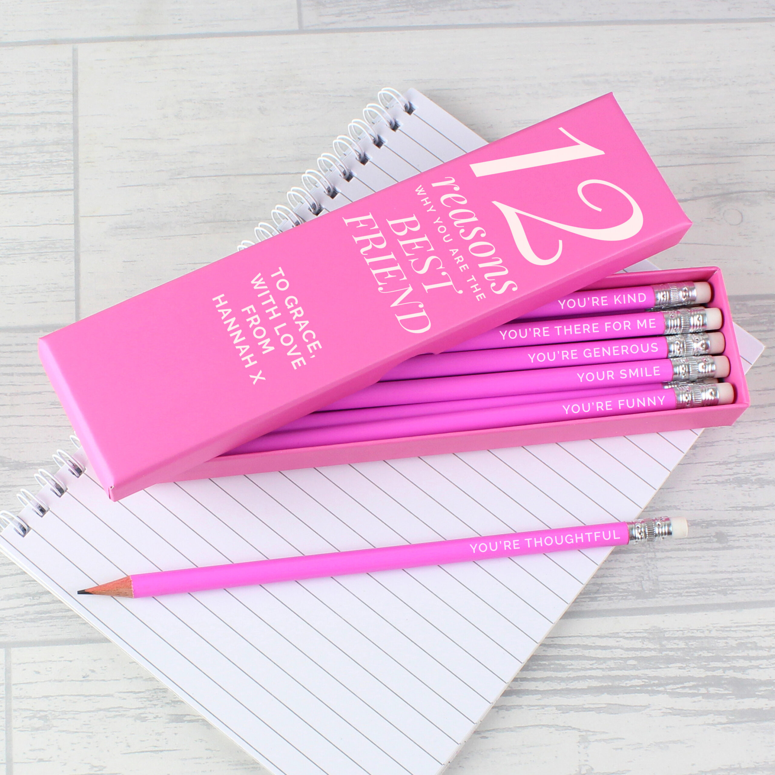 The sleek pink box serves as a canvas for your custom heading and message, while each of the 12 pencils inside is individually engraved with your own words.