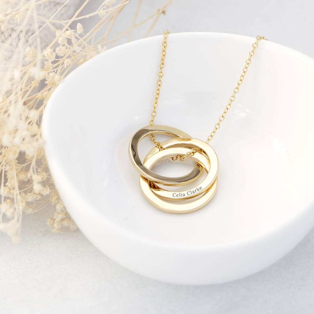 Personalise the necklace with a name or a couple’s initials, delicately engraved onto the interlocking rings to create a truly individual piece.