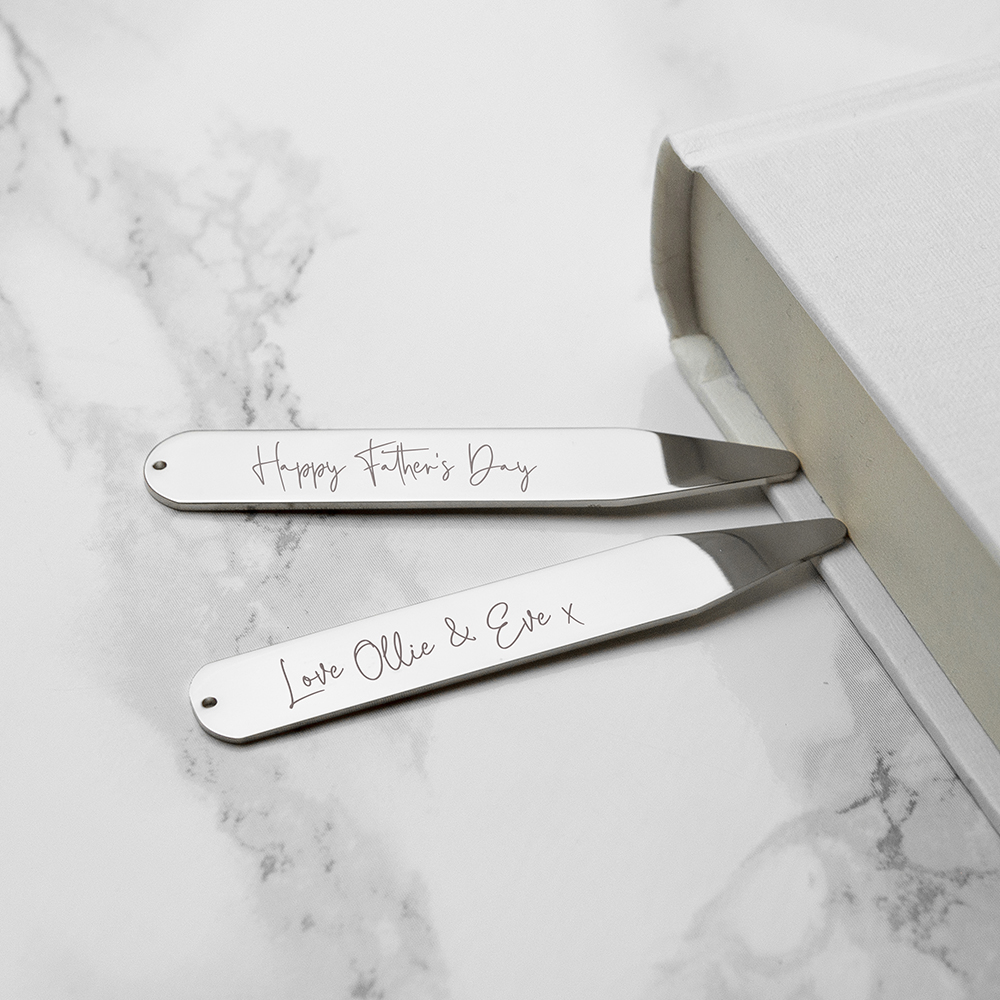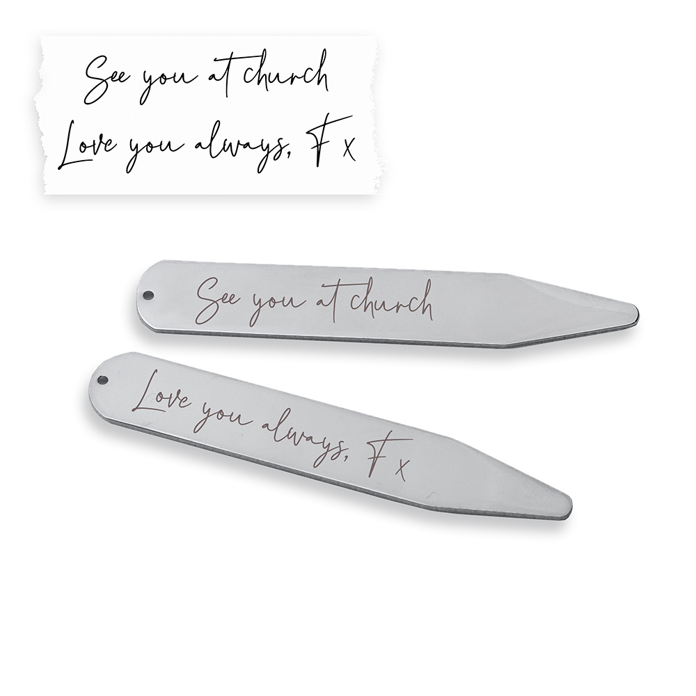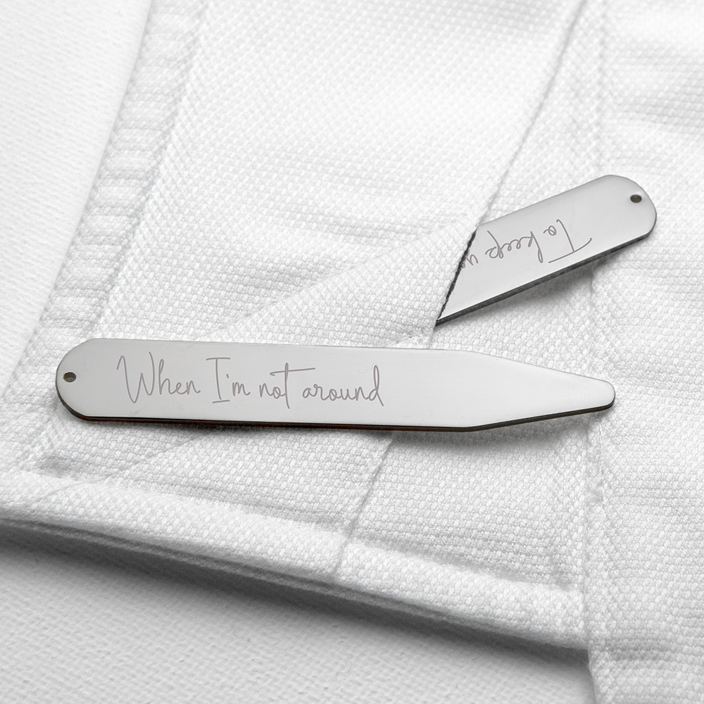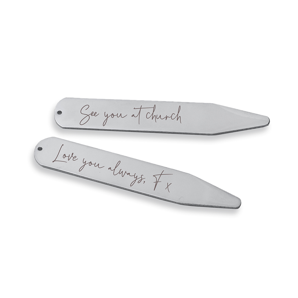 With our Personalised Silver Handwriting Collar Stiffeners, you can preserve that sentiment forever. Simply upload a high-resolution photo of the handwriting, and we will precision-engrave it onto these durable, silver rhodium-plated stays. It is the perfect blend of practical menswear and deep emotional significance—a secret message, written by hand, that stays tucked under his collar, visible only to him.