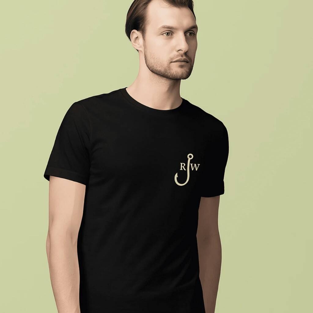 The design keeps it clean and understated. A fishing hook icon sits front and centre, flanked by an initial on either side of your choice — a simple but striking way to make it uniquely theirs.