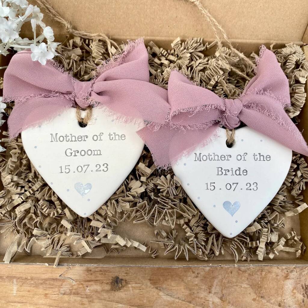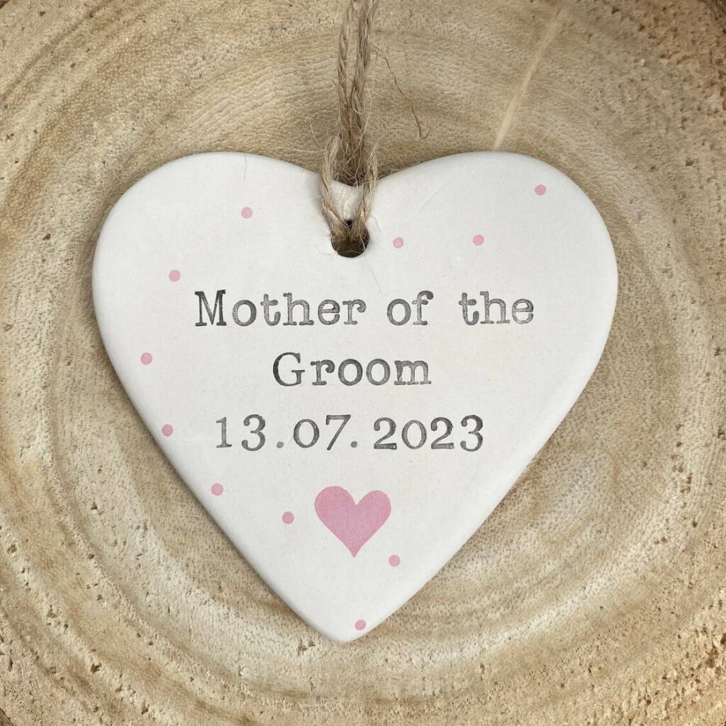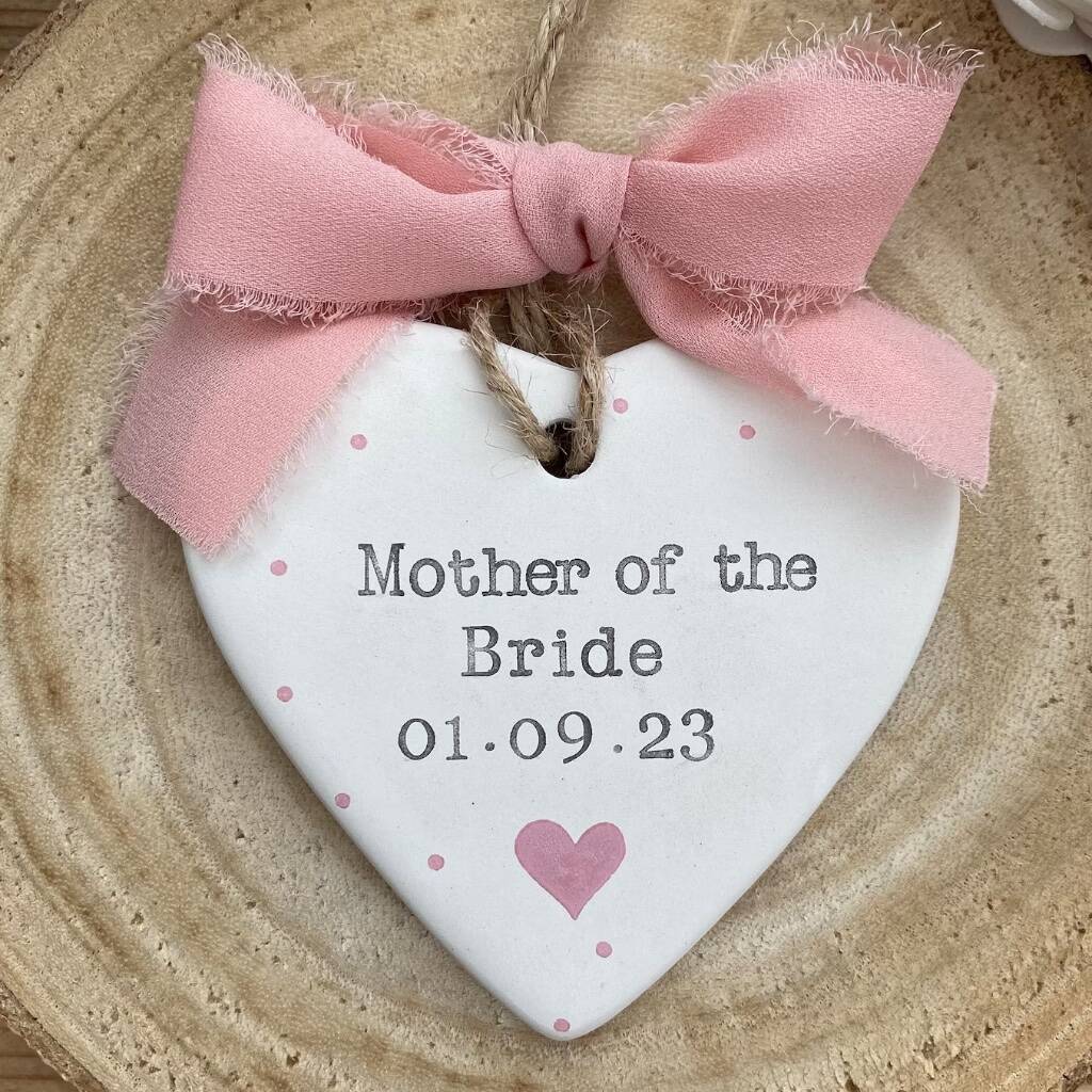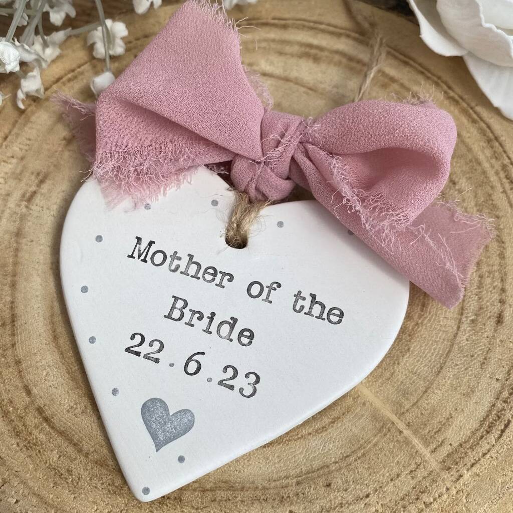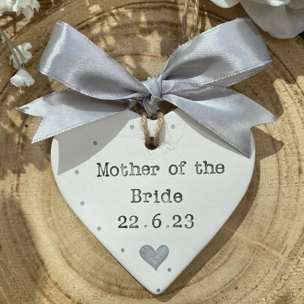 These Personalised Hand-Stamped Ceramic Heart Decorations make a thoughtful gift for a Mother of the Bride or Groom, Maid of Honour, Bridesmaid or Flower Girl — something small, meaningful and made to last.