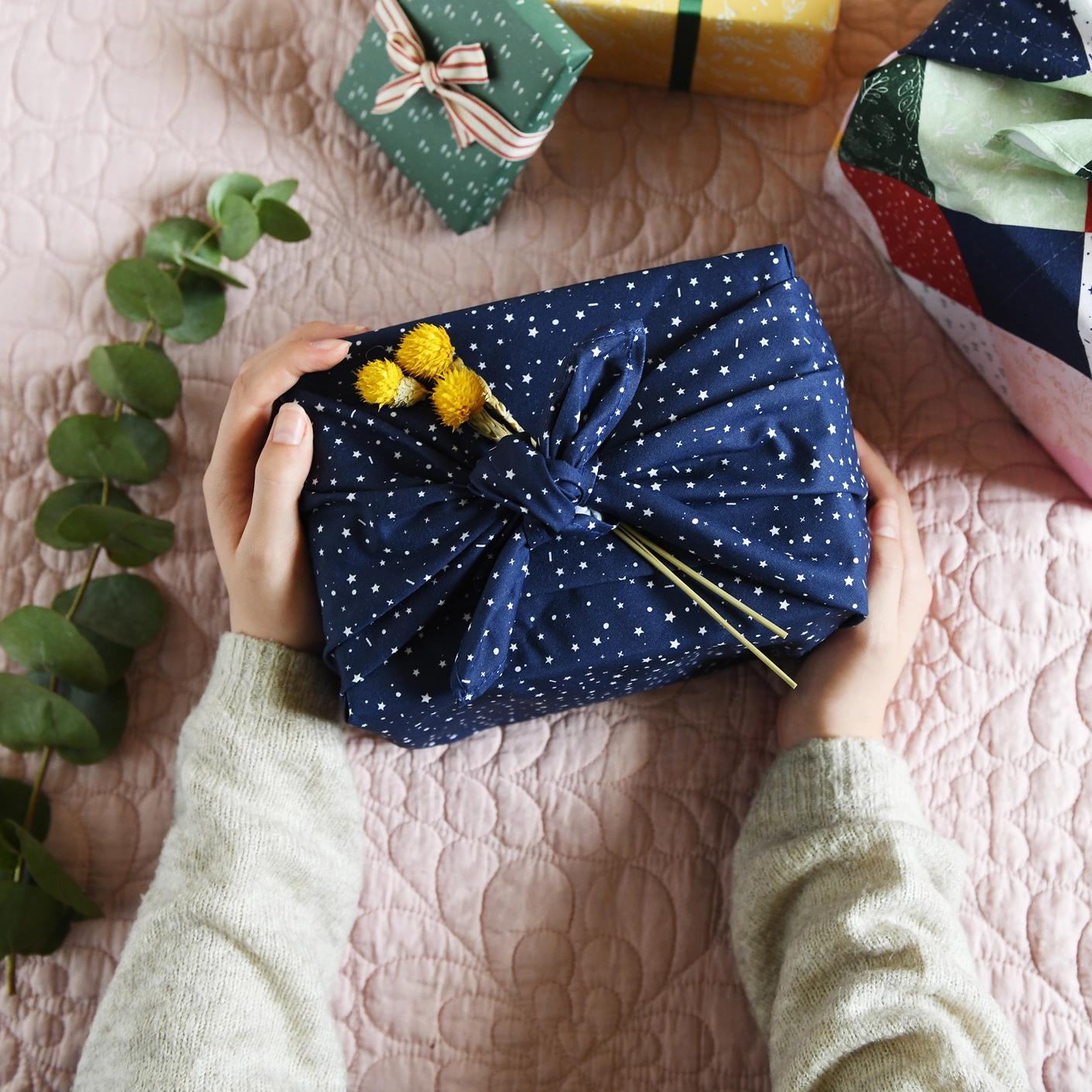 Replacing wrapping paper with a gorgeous fabric gift wrap is a sustainable and a beautiful eco-friendly way of packaging your gifts.