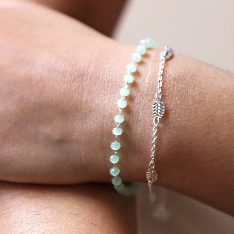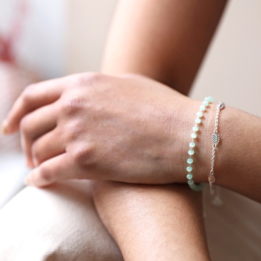 Beaded Crystal Bracelet: A delicate chain featuring a continuous stream of facet-cut, pale mint green crystal beads. The subtle sparkle and fresh colour make it light and sophisticated.