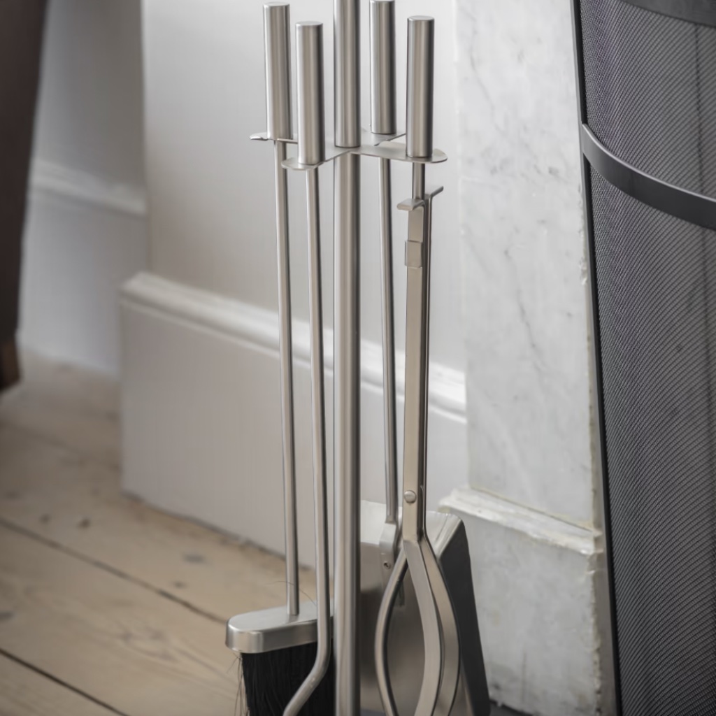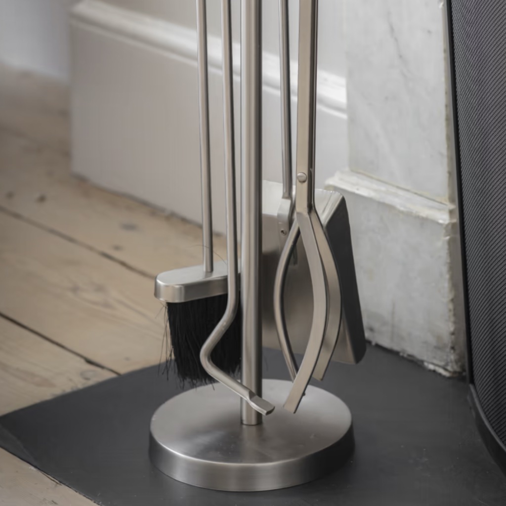 Use the tongs to position logs safely, the poker to keep the flames going strong, and the dustpan and brush to tidy up once the fire has burned down. Simple tools, done properly.